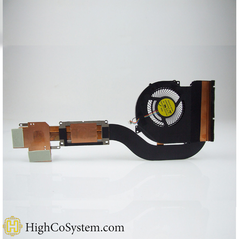 - هیتسینک برای گرافیک مجزا: این نسخه برای مدلهایی لازم است که به کارت گرافیک مجزای AMD FirePro مجهز هستند. این ماژول حرارتی قویتر است و یک مجموعه بزرگتر با دو صفحه تماس جداگانه دارد؛ یکی برای CPU و دیگری برای GPU مجزا. این نسخه معمولاً از لوله حرارتی و پرههای بیشتری استفاده میکند تا بار حرارتی اضافی ناشی از تراشه گرافیکی را مدیریت کند. شماره قطعات رایج این نسخه شامل 0VJF99 (VJF99) و 0W2PF6 (W2PF6) است.